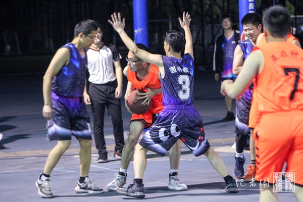 裁判的一声哨响拉开了比赛的序幕,两支队伍迅速地投入到了比赛中。身穿紫色球服的园林教工队首先以一个二分球拔得头筹,身穿橙色球服的亚非种业队紧追而上,快速地将比分追平。双方互有攻防,紧咬比分,比赛陷入胶着。“好球!”“漂亮!”令人惊叹的传球、快攻和扣人心弦的罚球、抢断在篮球场上轮番上演,欢呼声、喝彩声此起彼伏。最终,上半场比赛园林教工队与亚非种业队的比分为13:12。