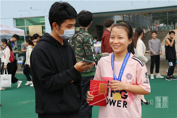在颁奖前,张娇萍坦言,由于大三学年学业比较紧张且自己管理着足球队,没有太多时间早训,以致赛前有点紧张,赛后有些脱力,但既然自己报了名就一定会跑完。张娇萍还向我们分享了保持良好身体状态的秘诀:“早上可以跑着去上课,在足球队时也注重身体素质的训练。”张娇萍对待跑步的态度也很有趣:“跑步就是要把该追的人追上,就像踢足球把该挡的人挡住,把自己该做好的事做好就行了。”在800米比赛之后,张娇萍又将迎来1500米和4*100米两个比赛项目,让我们一起期待她的好消息。