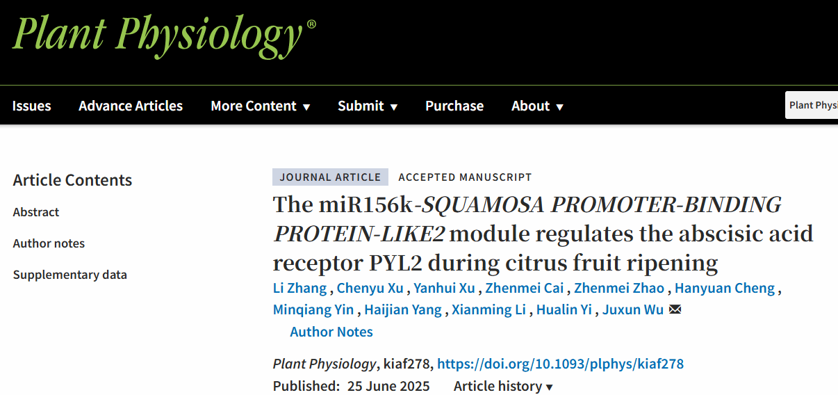 近日,澳门十大网投正规官网平台果蔬园艺作物种质创新与利用全国重点实验室伊华林/吴巨勋课题组在Plant Physiology发表了 “The miR156k-SQUAMOSA PROMOTER-BINDING PROTEIN-LIKE2 module regulates the abscisic acid receptor PYL2 during citrus fruit ripening”的研究论文,揭示了csi-miR156k通过靶向SPL2促进柑橘果实成熟的功能和分子机制。