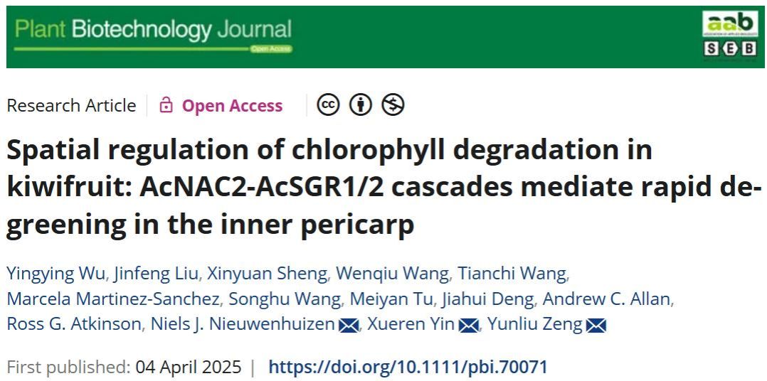 2025年4月4日,曾云流副教授领衔的猕猴桃团队联合安徽农业大学和新西兰皇家植物与食品研究所在Plant Biotechnology Journal在线发表了题为“Spatial regulation of chlorophyll degradation in kiwifruit: AcNAC2-AcSGR1/2 cascades mediate rapid de-greening in the inner pericarp”的研究论文。猕猴桃果肉存在不均褪绿现象,导致黄肉不黄,但是其调控机制并不清晰。该研究揭示了AcNAC2-AcSGR1/2级联模块调控猕猴桃内果肉快速褪绿的分子机制,并利用CRISPR/Cas9基因编辑技术突变关键NAC基因获得褪绿延迟型猕猴桃。该研究为通过遗传手段改良猕猴桃果肉色泽,选育快速褪绿猕猴桃种质资源提供了关键的分子靶标。