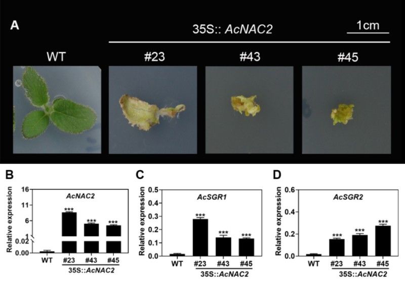为探究AcNAC2的生物学功能,该研究在猕猴桃中稳定过表达AcNAC2并获得3个过表达株系(AcNAC2#23,#43,#45; 图2)。与野生型(WT)相比,3个过表达株系均呈现明显的黄化表型。随后荧光定量PCR结果表明,AcNAC2的过表达能够显著诱导下游靶基因AcSGR1和AcSGR2的表达。