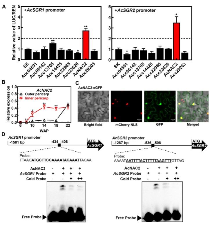 该研究在时空维度系统分析了黄肉红心猕猴桃‘红阳’果实发育过程中内/外果肉相关色素指标的动态变化,发现内果肉的叶绿素降解速率明显快于外果肉。内外果肉来自于同一个果实,也可确保发育阶段的一致性,是挖掘叶绿素降解调控基因的理想试材。利用转录组测序,结合基因表达验证和酶活性分析,获得2个在内果肉显著上调表达的叶绿素降解关键基因 AcSGR1和AcSGR2。通过加权基因共表达网络分析,发现AcSGR1/2的表达水平与9个候选差异转录因子均高度相关。后续烟草双荧光素酶和EMSA实验进一步证实,NAC转录因子AcNAC2能够直接结合AcSGR1和AcSGR2的启动子,显著激活其表达(图1)。荧光定量PCR结果显示,相较于外果肉,AcNAC2在内果肉更早表达且表达量更高。系统进化树分析发现,AcNAC2与AcNAC3高度同源,推测可能存在功能冗余。利用烟草双荧光素酶,发现AcNAC3能够微弱地激活AcSGR1和AcSGR2的表达,激活效应大约为1.5-1.6倍。以上结果说明,NAC家族成员在调控SGR基因表达方面可能存在一定的保守效应,其中AcNAC2可能发挥着主效作用。