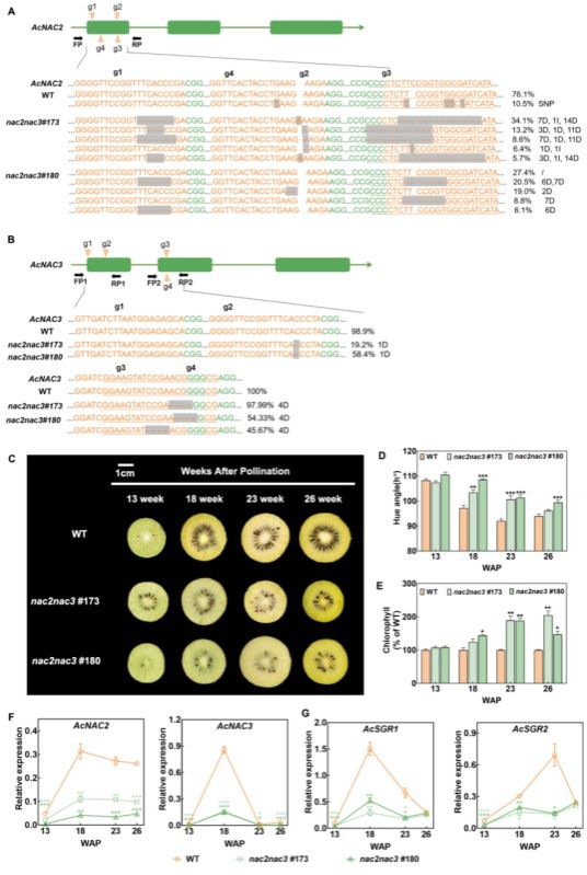 由于AcNAC2的过表达株系在后期继代培养中表现出致死的表型,无法获得生根植株进行后续研究。为进一步证实AcNAC2和AcNAC3在猕猴桃果实褪绿中的贡献,该研究利用CRISPR/Cas9基因编辑技术,创制了nac2nac3双突变体植株(#173和#180)(图3)。与野生型(WT)果实相比,突变体果实的果肉褪绿进程明显延缓,且色度角和叶绿素含量则显著升高。相较于WT果实,AcNAC2和AcNAC3以及下游靶基因AcSGR1和AcSGR2在突变体果实中的表达丰度也均显著降低。综上,该研究通过猕猴桃遗传转化结合分子生物学手段,揭示了猕猴桃不同果肉组织叶绿素差异代谢的关键NAC-SGR级联调控通路,为不同色泽果实育种提供分子靶标。