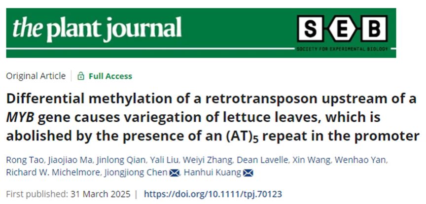 2025年3月31日,澳门十大网投正规官网平台果蔬园艺作物种质创新与利用全国重点实验室和湖北省洪山实验室匡汉晖教授团队在《the plant journal》发表了题为“Differential methylation of a retrotransposon upstream of a MYB gene causes variegation of lettuce leaves, which is abolished by the presence of an (AT)5 repeat in the promoter”的研究论文。该研究揭示了生菜MYB转录因子启动子区域的DNA甲基化差异导致叶片红色斑点形成的分子机制,并发现启动子区域存在特定长度的简单重复序列时,叶片会呈现均匀的红色表型。