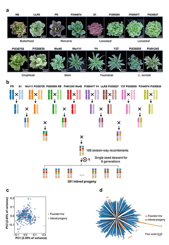 生菜是全球重要的叶用蔬菜,叶片颜色、形态和开花时间是决定其商品价值的关键农艺性状。但其丰富的园艺类型和显著的群体结构异质性为遗传解析带来挑战,传统双亲群体因遗传多样性有限,难以全面解析复杂性状。为此,研究团队历时多年,利用16个遗传背景丰富的生菜种质(包含结球、散叶、罗马等栽培材料14个和野莴苣材料2个),首次成功构建包含381个重组自交系的莴苣多亲本高世代互交(MAGIC)群体。全基因组测序分析表明,该群体遗传结构均匀、重组事件丰富,突破了传统群体结构的限制,为高效全基因组关联分析(GWAS)奠定了基础(图1)。