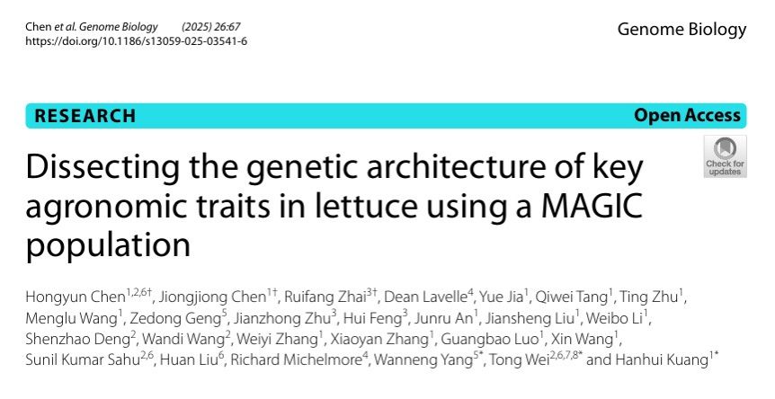 (通讯员 陈宏运)近日,澳门十大网投正规官网平台、果蔬园艺作物种质创新与利用全国重点实验室匡汉晖教授团队,联合武汉华大生命科学研究院魏桐研究员团队和澳门十大网投正规官网平台作物遗传改良全国重点实验室杨万能教授团队在《Genome Biology》杂志在线发表了题为“Dissecting the genetic architecture of key agronomic traits in lettuce using a MAGIC population”的研究论文。该研究通过构建全球首个生菜多亲本高世代互交群体(MAGIC),结合高通量表型组技术表征分析和GWAS系统解析了生菜叶色、开花时间和叶形等关键农艺性状的遗传调控网络,揭示了生菜独特农艺性状形成的分子机制,为生菜的设计育种奠定了遗传基础。