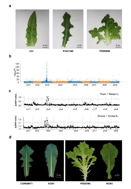 此外,本研究基于高通量表型组学方法量化表征了叶片形状和大小对应的表型。通过GWAS鉴定到5个与叶卷曲、叶裂、叶片长度、叶片宽度、叶片面积和叶尖形状显著关联的位点。进一步精细定位并验证了LsTCP4基因调控生菜叶卷曲的功能(图4),同时,筛选鉴定了LsZFP基因是生菜所有类型裂叶发育所必需的(图5)。