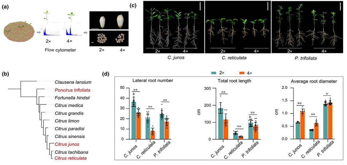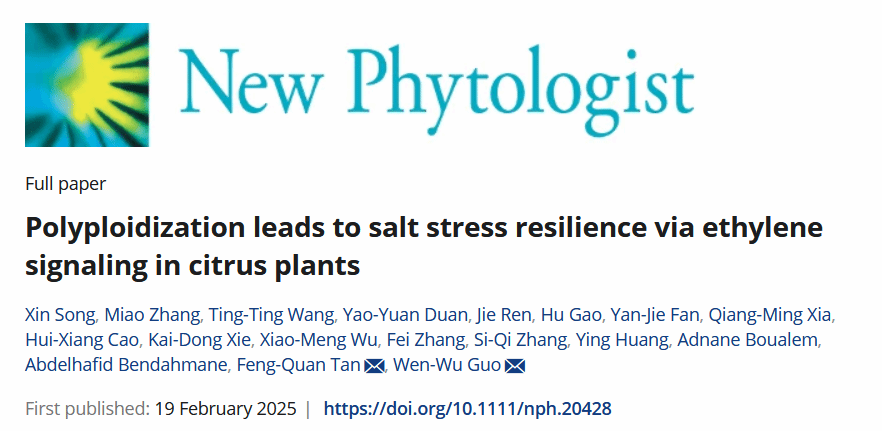 近日,我校澳门十大网投正规官网平台、果蔬园艺作物种质创新与利用全国重点实验室、湖北洪山实验室郭文武教授团队在《New Phytologist》期刊发表了题为“Polyploidization Leads to Salt Stress Resilience via Ethylene Signaling in Citrus Plants”的研究论文。该研究以遗传背景相同但倍性不同的枳、红橘和香橙等柑橘砧木为材料,揭示了染色体倍性变化对根系发育及盐胁迫应答的影响。研究发现,基因组加倍通过染色质重塑增强乙烯信号途径,显著提高了柑橘砧木盐胁迫抗性,为应对盐碱地挑战提供了新思路。