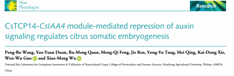 近日,New Phytologist期刊在线发表了澳门十大网投正规官网平台果蔬园艺作物种质创新与利用全国重点实验室/湖北洪山实验室郭文武教授/伍小萌教授团队题为“CsTCP14- CsIAA4 module- mediated repression of auxin signaling regulates citrus somatic embryogenesis”的研究论文,该研究揭示了CsTCP14- CsIAA4模块介导的生长素信号抑制对柑橘体细胞胚发生的重要作用,为提高柑橘胚性愈伤组织离体再生效率和促进柑橘生物技术育种提供了理论依据和调控途径。