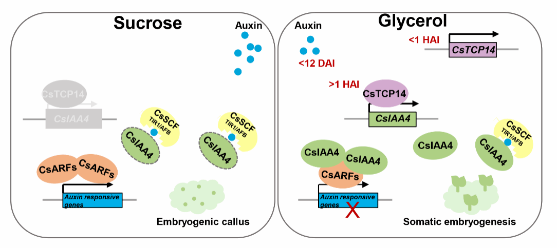 该研究发现柑橘胚性愈伤组织转移至甘油培养基后,生长素信号迅速减弱,CsTCP14和CsIAA4先后被诱导表达。CsTCP14结合CsIAA4启动子激活其表达;在过量表达CsTCP14的胚性愈伤组织中,CsIAA4被激活表达,生长素信号减弱;过表达编码稳定IAA蛋白的CsIAAm突变序列,也抑制胚性愈伤组织生长素信号响应,进而提高体细胞胚发生能力。外源添加IAA,抑制体细胞胚发生;而添加生长素信号抑制剂PCIB,促进体细胞胚发生(图1)。CsIAA4和CsTCP14过表达促进体细胞胚发生能力的效应被外源IAA减轻,却被PCIB进一步加强。由此构建了CsTCP14- CsIAA4模块通过抑制生长素信号从而促进柑橘体细胞胚发生的调控通路(图2)。该研究首次明确了生长素信号在甘油培养基诱导柑橘体细胞胚发生过程中的重要作用,为解决生物技术用于柑橘种质创制的再生瓶颈提供了理论依据和调控途径。