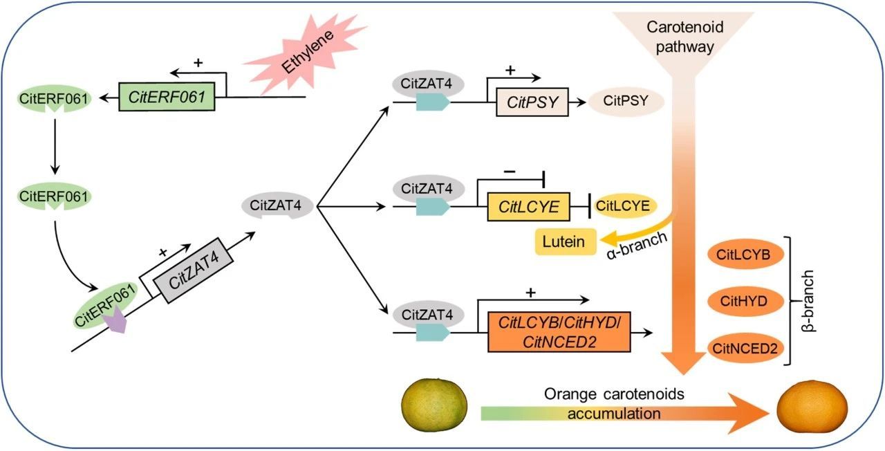研究人员和前人研究报道均发现,乙烯处理通过抑制α支路黄色类胡萝卜素 (叶黄素为主) 富集,促进β支路橙色类胡萝卜素 (β-胡萝卜素、β-隐黄质为主) 积累,促使温州蜜柑果皮着橙色。研究人员明确了LCYE和HYD为上述过程中的关键类胡萝卜素基因,并基于LCYE和HYD筛选到一个C2H2型转录因子ZAT4。通过柑橘果实瞬时表达实验和柑橘愈伤组织稳定转化实验,并结合分子生化实验,明确CitZAT4响应乙烯信号,通过转录抑制α支路类胡萝卜素基因 (LCYE) 和转录激活β支路类胡萝卜素基因 (LCYB和HYD等),促进类胡萝卜素代谢流倾向地流向β支路,从而促使温州蜜柑果皮着橙色。