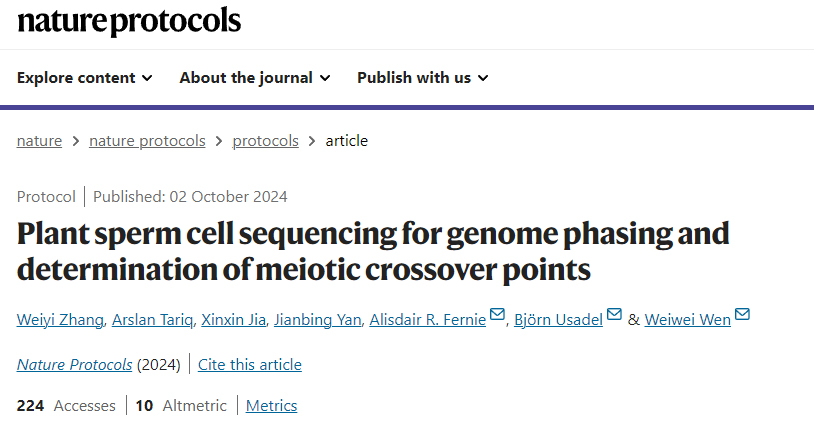 近日,我校果蔬园艺作物种质创新与利用全国重点实验室、澳门十大网投正规官网平台茶学团队闻玮玮教授课题组在Nature Protocols发表题为“Plant sperm cell sequencing for genome phasing and determination of meiotic crossover points”的研究论文。该论文详细介绍了一种依托单精子测序技术的基因组分型新方法。