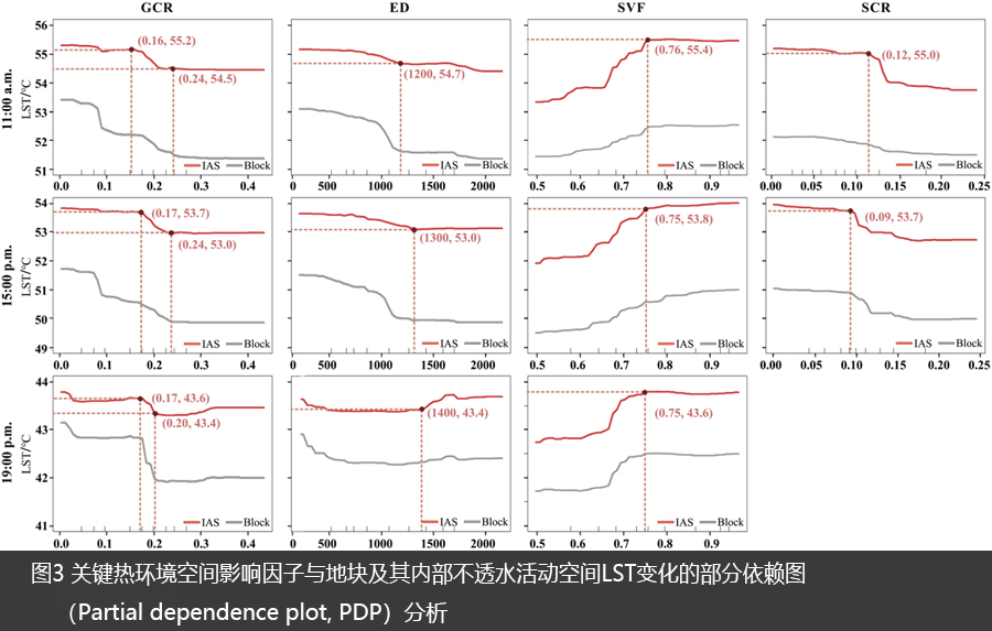 图3 关键热环境空间影响因子与地块及其内部不透水活动空间LST变化的部分依赖图(Partial dependence plot, PDP)分析