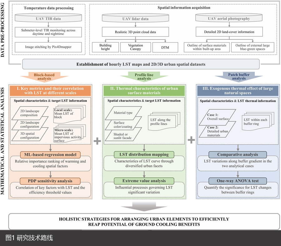 准确析取多样化城市景观元素及其空间形态特征对热环境的影响规律是明确城市降温设计策略的重要前提。然而,受到观测精度的限制,当前基于卫星反演的混合热像元难以精确捕捉异质化城市下垫面温度的时空分异,为探索城市空间特征的热效应及适应性设计带来了不确定性。利用无人机平台获取的亚米级地表温度(Land surface temperature,LST)数据及高精度三维空间信息,研究以武汉市为例在夏季日加热周期中评估城市空间形态特征、下垫面材质类型及大型蓝绿基础设施对建成环境内部热环境的综合影响,识别关键影响因子及其驱动机制,进而提炼改善城市热环境的高效设计策略。