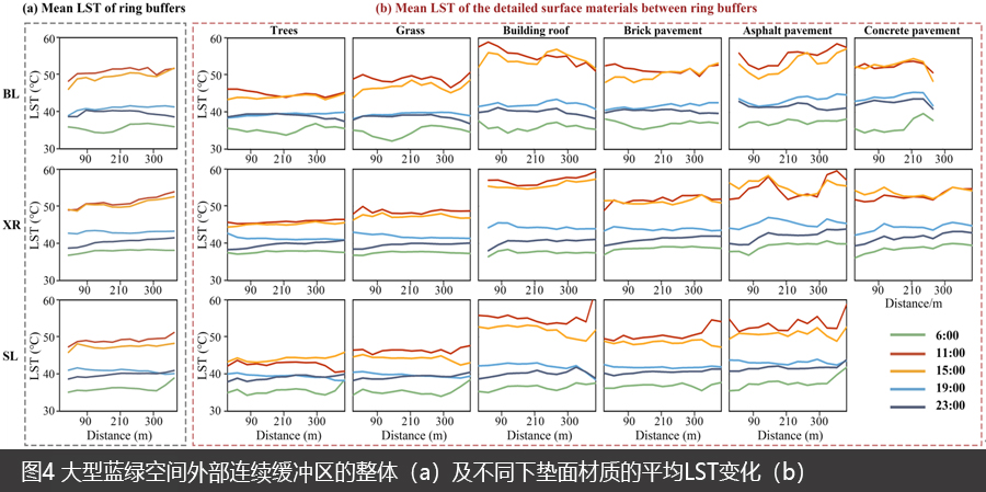 图4 大型蓝绿空间外部连续缓冲区的整体(a)及不同下垫面材质的平均LST变化(b)