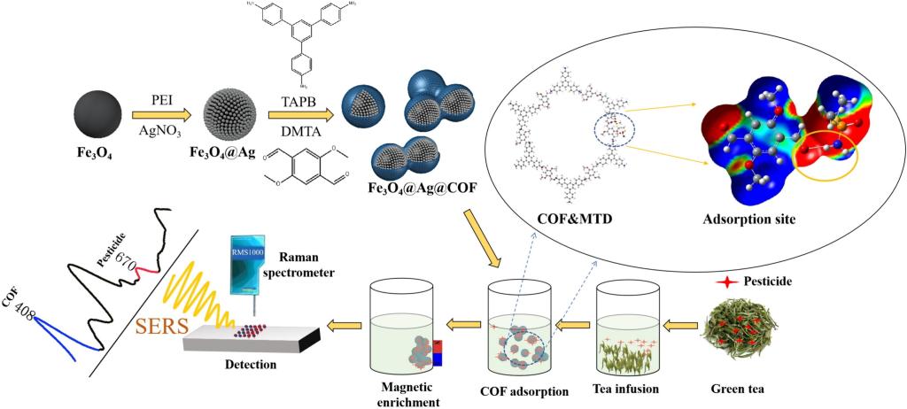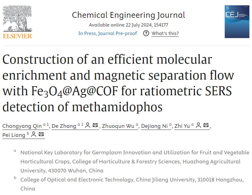 近日,澳门十大网投正规官网平台/果蔬园艺作物种质创新与利用全国重点实验室倪德江教授团队张德副研究员和余志副教授在国际顶级学术期刊Chemical Engineering Journal上在线发表了题为“Construction of an efficient molecular enrichment and magnetic separation flow with Fe3O4@Ag@COF for ratiometric SERS detection of methamidophos”的研究论文。本研究提出了一种可以在茶叶复杂基质中高效磁性富集、快速检测甲胺磷农药残留的有效策略,为保障茶叶质量安全奠定了研究基础。