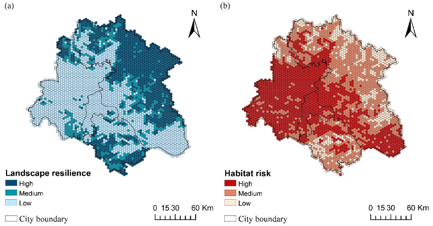 图2. 景观韧性(a)和生境风险(b)评估结果