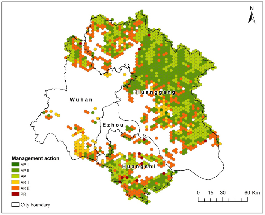 研究以武汉都市圈核心区为例,将其划分为3307个规划单元。结果表明,研究区域近一半的森林面临中度至高度退化的风险,说明急需采取积极和有效的管理措施。具体而言,在API、APII和PP区域,规划单元的数量分别为5、631和498个,分别涵盖了32.89、5023.72和4593.79平方公里的残存森林生境。在ARI、ARII和PR区域,分别有106、402和13个规划单元,相应涵盖了497.11、2013.98和70.10平方公里的残存森林。分区规划结果将为武汉都市圈核心区森林规划和管理提供决策支持与建议,以提升区域森林生物多样性保护成效。