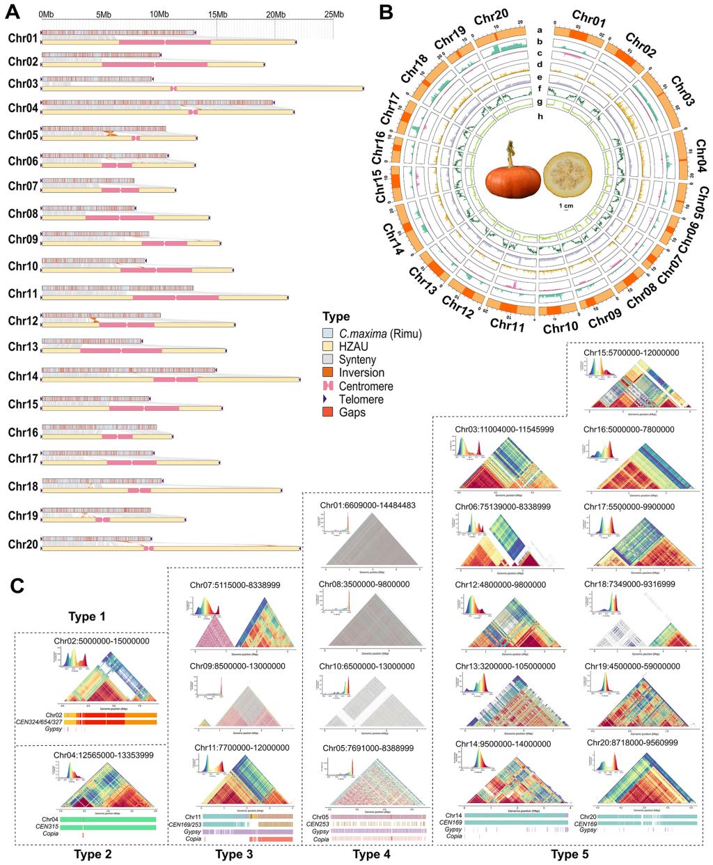 该研究以耐盐南瓜材料HZAU(Cucurbita maxima)为研究对象,在PacBio HiFi和ONT ultra-long测序的基础上,结合Hi-C测序技术,组装了一个T2T and gap-free的完整基因组,其长度为345.14 Mb,contig N50为16.35 Mb。相比之前发布的基因组,新增了133.64 Mb新的序列,且每条染色体都有完整的端粒和着丝粒区域,是目前组装质量最高的南瓜基因组。