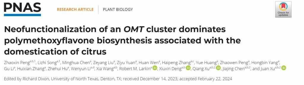 近日,《Proceedings of the National Academy of Sciences, PNAS》刊物在线发表了澳门十大网投正规官网平台/果蔬园艺作物种质创新与利用全国重点实验室徐娟教授课题组题为“Neofunctionalization of anOMTcluster dominates polymethoxyflavone biosynthesis associated with the domestication of citrus”的研究论文,该研究综合运用正向和反向遗传学、代谢组学、酶动力学分析及生物信息学等技术,揭示了柑橘重要功能性成分聚甲氧基黄酮(Polymethoxyflavones,PMFs)的种质特异积累现象,鉴定了PMFs生物合成的关键串联重复OMT基因簇,同时解析了该OMT簇在柑橘亚科中的起源和演化历程,为柑橘果实功能性品质遗传改良提供了理论依据和重要基因资源。