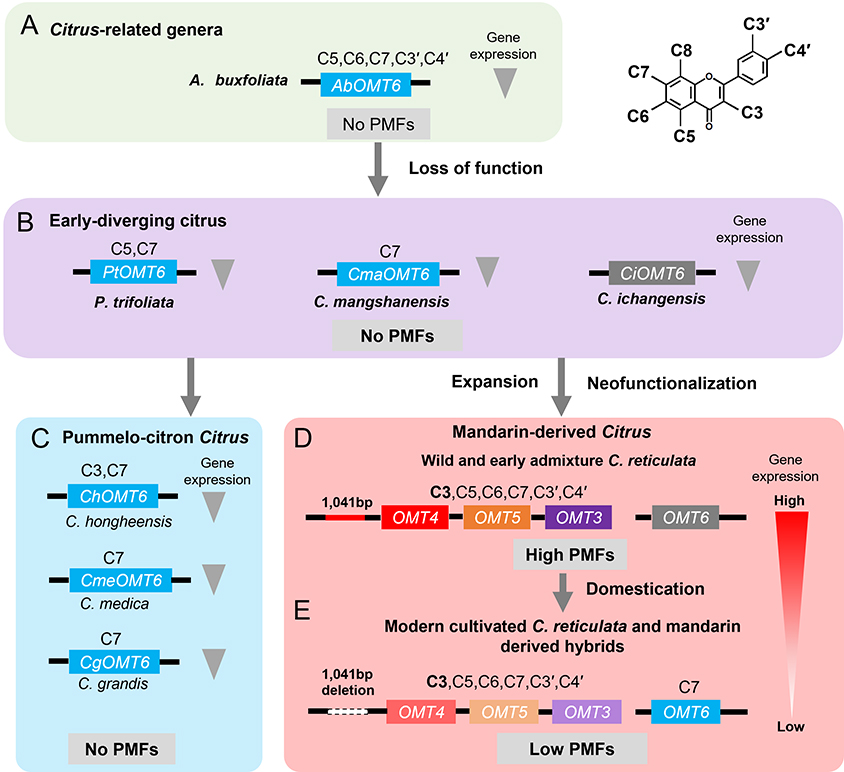 图3. 柑橘中OMT簇和OMT6的主导PMFs生物合成通路的演化轨迹模型