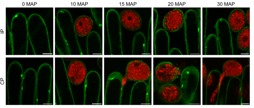 图1. 自交不亲和型拟南芥授粉后不同时间点的显微观察(IP,不亲和授粉;CP,亲和授粉)