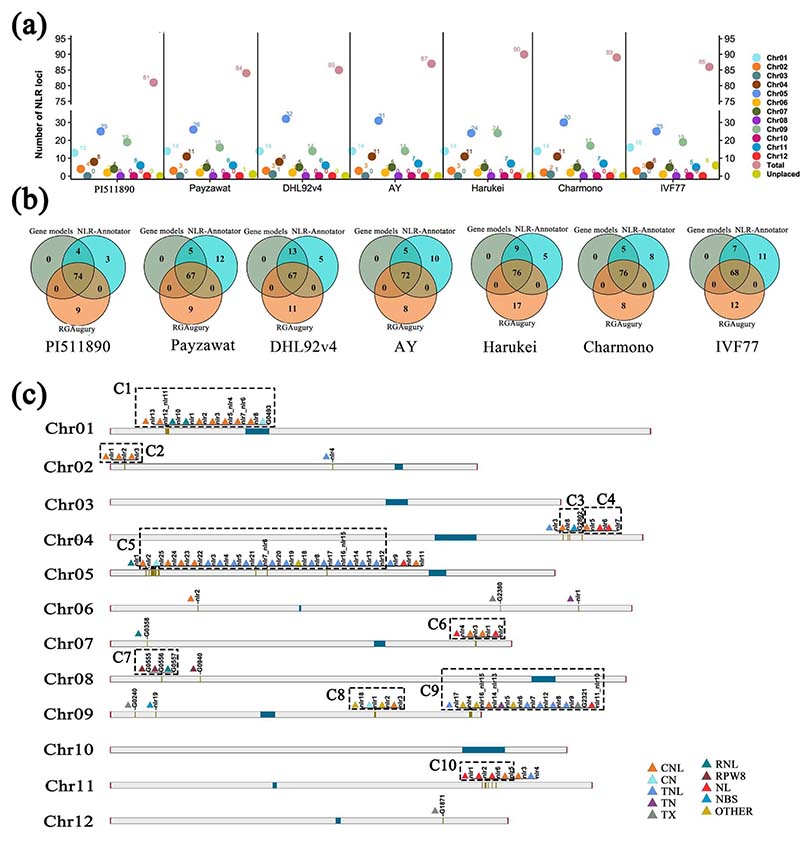 随后,该研究鉴定了甜瓜基因组中的抗性基因类似物(RGA)并对NLR类型的RGA进行重新注释。在PI511890基因组上注释到80个NLR,其中64个NLR成簇分布。该研究进一步对6个已发表的甜瓜基因组的NLR进行了重新注释,构建了一个包含226非冗余NLR的泛NLR组。该泛NLR组包含18个核心NLR基因和208个可变NLR基因。该研究结果不仅为甜瓜遗传改良提供了高质量的基因组资源,同时还为甜瓜抗病基因发掘提供首个可作为无偏参考的泛NLR组。