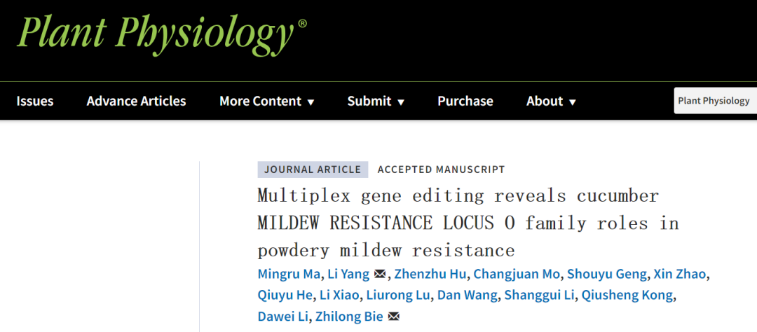 近日,澳门十大网投正规官网平台别之龙教授/杨丽副教授团队在Plant Physiology在线发表了题为“Systemic analysis of cucumber MLO family by multiplex gene editing for engineering powdery mildew resistance”的研究论文。在瓜类作物中首次建立高效的多基因编辑体系,利用该体系靶向敲除黄瓜CsMLO基因家族13个成员,成功获得白粉病完全抗性黄瓜种质材料,并通过多组学联合分析解析了钙信号参与Csmlo1/8/11介导的黄瓜白粉病抗性分子机制。