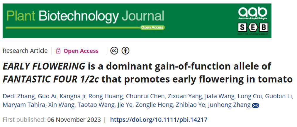 近日,果蔬园艺作物种质创新与利用全国重点实验室张俊红教授课题组在Plant Biotechnology Journal发表了题为“EARLY FLOWERINGis a dominant gain-of-function allele ofFANTASTIC FOUR 1/2cthat promotes early flowering in tomato”的研究论文。该研究克隆了一个番茄早花新基因FANTASTIC FOUR 1/2c(FAF1/2c),并解析了该基因调控番茄开花时间的作用机制。研究结果丰富了番茄开花时间调控网络,为番茄花期改良提供了新的基因资源和理论指导。