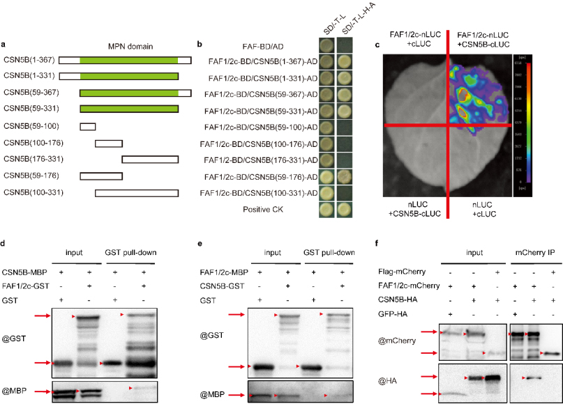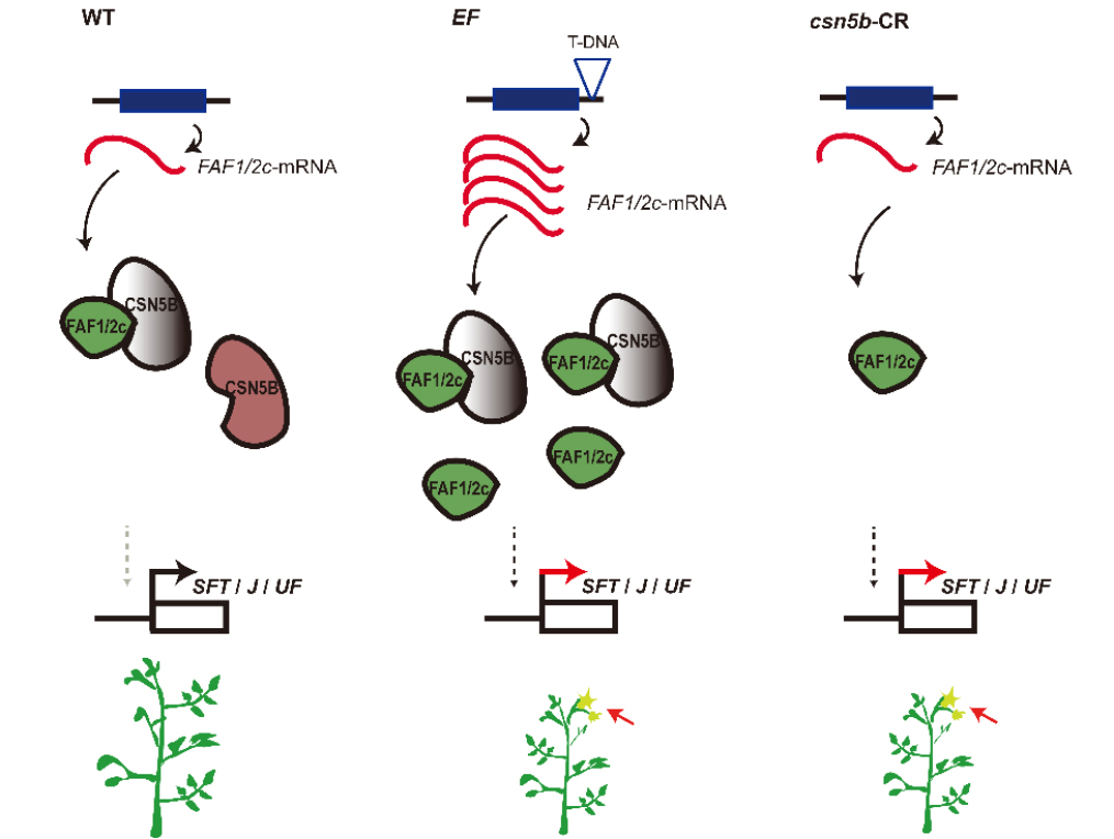 进一步生化实验(Y2H、Pull-down、Split-LUC、Co-IP)发现FAF1/2c与COP9信号复合体亚基5B(CSN5B)蛋白互作,转基因敲除CSN5B导致番茄植株开花。过表达FAF1/2c和突变CSN5B都导致番茄早花,说明FAF1/2c和CSN5B在番茄开花调控中发挥相反作用,因此猜测FAF1/2c和CSN5B在蛋白水平上可能存在拮抗作用。进一步的研究证实FAF1/2c与CSN5B蛋白互作,影响CSN5B蛋白稳定性,降低CSN5B蛋白的积累,上调SINGLE FLOWER TRUSS(SFT)、JOINTLESS(J)和UNIFLORA(UF)等番茄促花基因的表达,进而调控番茄开花时间。