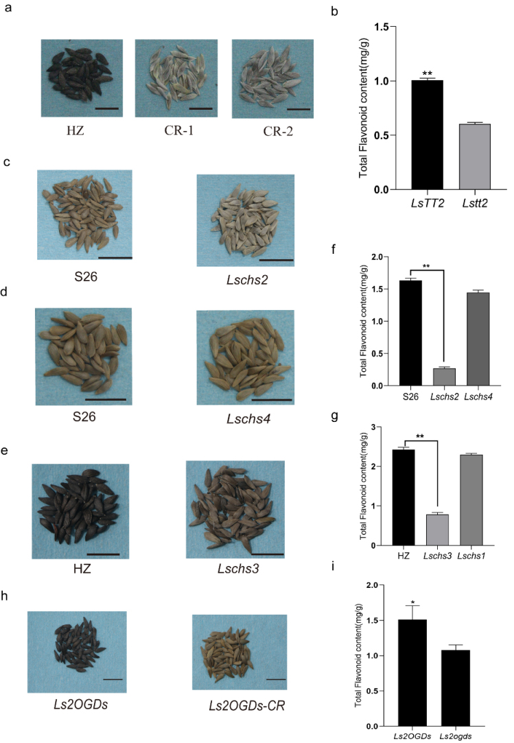 同时为了解析控制莴苣黄色种子的遗传基础,利用白色种子亲本(X5)和黄色种子亲本(W7)杂交,其中发现F1种子为黑色。F1自交后获得的F2分离群体,利用黄色和黑色种子的单株定位控制黄色的位点,发现在候选区段内至少有10个与类黄酮生物合成有关的基因。将候选基因进行功能验证,在黑色种子材料中敲除2-oxoglutarate-dependent dioxygenase(2OGD)基因,种子颜色从黑色变为黄色,其突变体种皮中的黄酮含量也显著降低。同时,敲除LsCHS基因后,该突变体的种子颜色强度降低,种皮黄酮含量也随之降低,说明LsCHS同源基因在莴苣种子颜色的形成中也起到重要作用。本研究为植物类黄酮生物合成调控提供了新的思路。