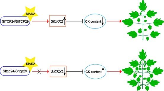 进一步研究发现SlTCP24和SlTCP29能够形成同源及异源二聚体,并且SlAS2可以减弱它们二聚体互作的强度。已有报道发现细胞分裂素参与调控叶片型态,SlTCP24和SlTCP29可以直接结合细胞分裂素降解基因SlCKX2启动子上的顺式元件,并且促进SlCKX2的转录。在SlTCP24和SlTCP29双基因敲除的转基因植株中,SlCKX2的转录水平降低,细胞分裂素水平升高,导致叶片形态更加复杂。总的来说,该研究揭示了番茄复合叶片发育的两个关键调控因子及其参与细胞分裂素代谢途径的靶基因。