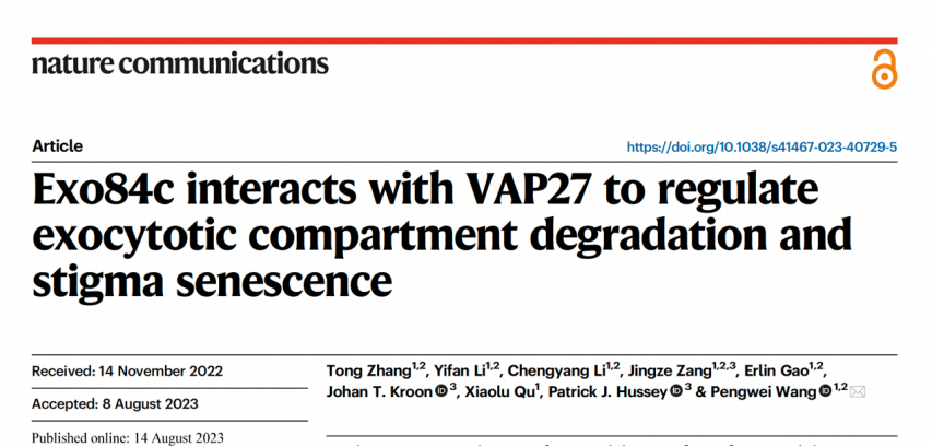 植物花器官寿命决定了有效授粉期,并最终决定了种子数量,柱头组织负责花粉的识别和接受,从而影响花粉管萌发及双受精过程的完成。近日,澳门十大网投正规官网平台果蔬园艺作物种质创新与利用全国重点实验室、湖北洪山实验室王鹏蔚教授课题组在植物花器官衰老机制方面取得突破性进展,在Nature Communications上发表题为“Exo84c interacts with VAP27 to regulate exocytotic compartment degradation and stigma senescence”的研究成果(图1)。