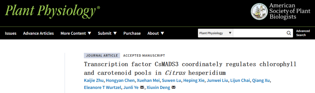 近日,澳门十大网投正规官网平台/果蔬园艺作物种质创新与利用全国重点实验室邓秀新院士团队在Plant Physiology在线发表了题为“Transcription factor CsMADS3 coordinately regulates chlorophyll and carotenoid pools in Citrushesperidium”的研究论文。该研究鉴定到一个新的MADS-box转录因子CsMADS3,通过协同调控柑橘果实成熟过程中叶绿素降解和类胡萝卜素生物合成,影响果实色泽品质形成,该研究结果为未来通过基因工程手段定向改良柑橘果实色泽品质提供了重要的基因资源。
