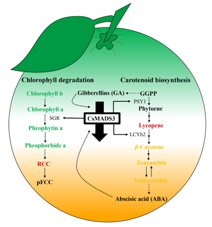 课题组前期挖掘到两个直接调控柑橘类胡萝卜素代谢的MADS转录因子MADS6(Plant Physiology, 2018, 176(4): 2657-2676)和MADS5(Journal of Experimental Botany, 2021, 72 (8): 3028-3043)。该研究在此基础上,鉴定到一个新的MADS-box转录因子CsMADS3,通过协同调控叶绿素降解和类胡萝卜素合成参与柑橘果实着色。CsMADS3在柑橘果实发育和转色过程中被显著诱导表达,果实破色期前后达表达高峰。在柑橘愈伤组织、柑橘果实和番茄中超量表达CsMADS3均显著增加了类胡萝卜素含量,并且诱导类胡萝卜素合成通路相关基因的表达,同时加速了叶绿素的降解并激活叶绿素降解基因的表达。相反,在柑橘愈伤组织和果实中干涉CsMADS3的表达会抑制类胡萝卜素的生物合成和叶绿素的降解,并下调相关代谢通路基因的表达。进一步实验证明,CsMADS3能够直接结合类胡萝卜素生物合成途径中的两个关键基因--八氢番茄红素合成酶1(CsPSY1)和番茄红素β-环化酶(CsLCYb2)以及叶绿素降解关键基因STAY-GREEN(CsSGR)的启动子并激活这些基因表达。此外,CsMADS3还可能通过影响植物激素ABA和GA的积累水平,进而间接调控柑橘果实叶绿素和类胡萝卜素代谢。这些发现揭示了柑果类果实叶绿素和类胡萝卜素代谢库的协同转录调控机制,有助于未来柑橘果实色泽的遗传改良。