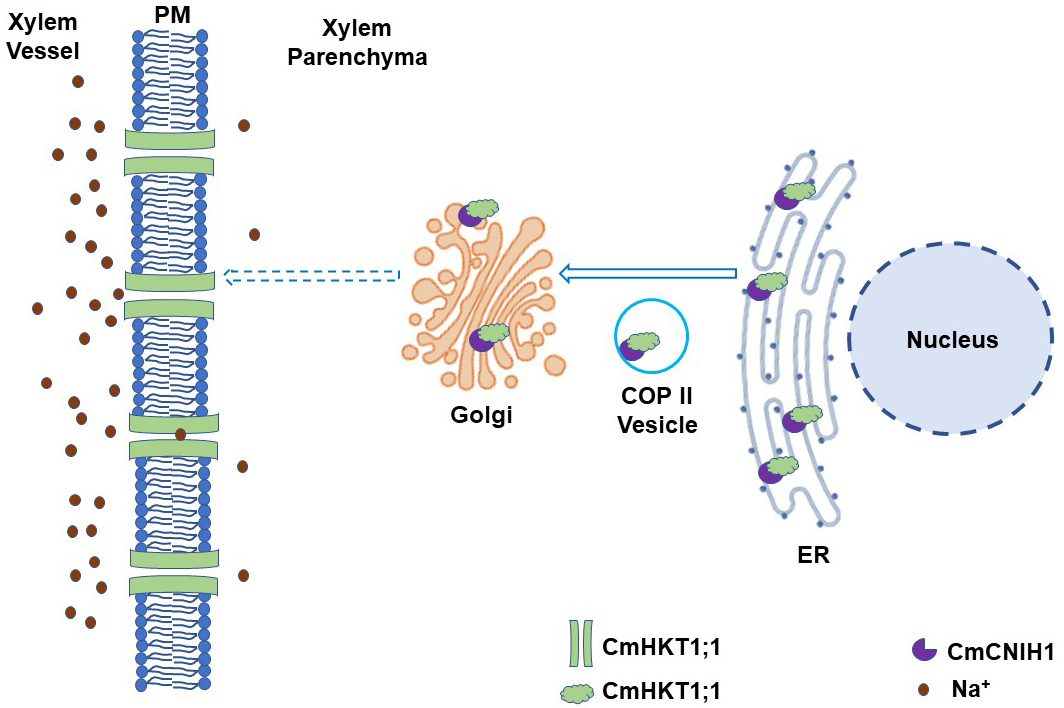 此外,CmCNIH1明显受到盐胁迫诱导表达,对CmCNIH1敲除材料的耐盐性评价结果表明,CmCNIH1对于南瓜在盐胁迫下维持Na+/K+稳态具有重要作用。基于以上结果,研究团队提出了CmCNIH1调控CmHKT1;1介导南瓜盐胁迫响应的工作模型:盐胁迫下CmCNIH1表达量上升,通过促进CmHKT1;1运输到质膜,进而CmHKT1;1得以发挥功能来维持一个相对稳定的Na+/K+比例,从而避免盐胁迫对植物造成的伤害(图3)。