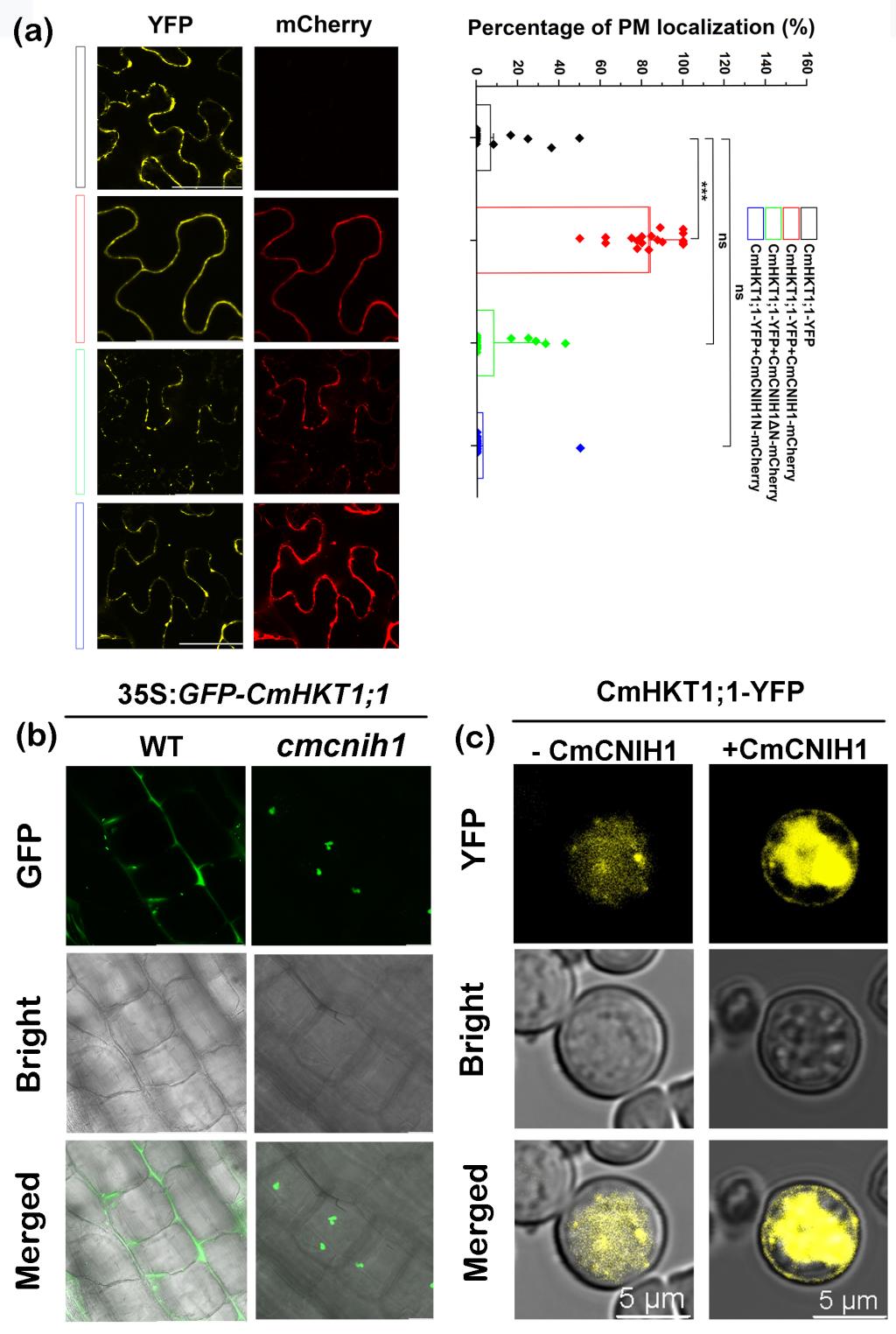研究团队进一步利用其建立的南瓜根系瞬时转化体系、烟草瞬时表达、酵母异源表达及非洲爪蟾卵母细胞系统等多种手段,证明了完整的CmCNIH1蛋白对于CmHKT1;1的质膜定位的重要性(图2)。