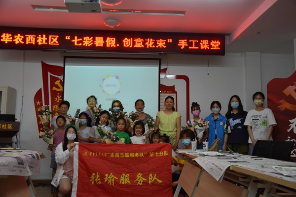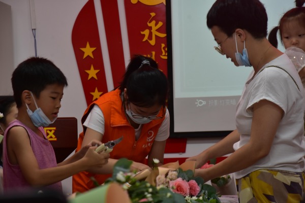 【核心提示】7月7日上午,张瑜服务队前往我校西社区武汉阳光社会工作服务中心,和阳光社工一起为小朋友们科普花语及花束包装知识,协助小朋友及家长完成花束包装作品。