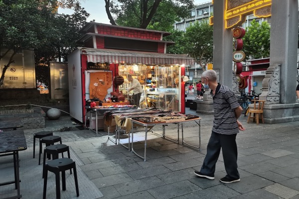 吉庆街是武汉打造的的民俗聚集地、非遗文化承载空间和展示窗口,尽展古韵历史,尽秀民俗风情。进入吉庆街正门后,实践团就遇见一位传承人正伏案埋首雕刻,用工具对牛皮进行处理,使其变成精美的图案。据了解,这便是是非物质文化遗产皮塑皮雕技艺。在传承人的允许下,实践团成员进行了视频拍摄,希望在后期借此宣传,让更多人了解这项技艺。