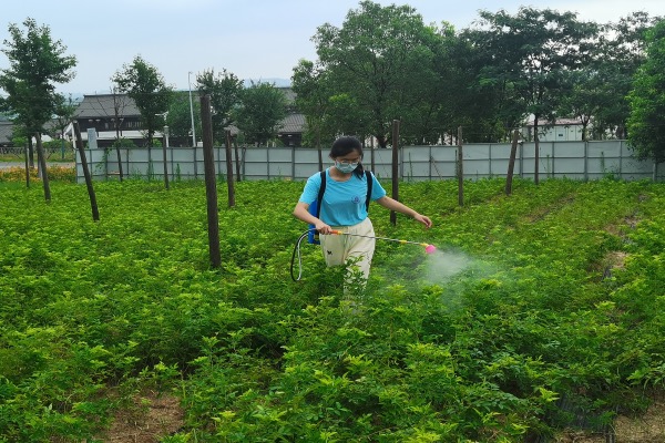 7月9日上午,实践团在月季砧木培育基地管理人员李师傅的带领下,体验了田间实操工作:对生长期的月季苗木进行吡虫啉等药剂喷洒处理以预防病虫害。在烈日炎炎的天气里,成员们轮番上阵,背上三十余斤的打药桶,合作完成了七万株月季苗木培育地的药剂喷洒工作。施药完毕后,成员们主动协助李师傅拔除田间杂草,以改善月季生长的田间环境。