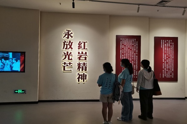 7月12日,实践团成员前往红岩革命纪念馆进行参观。馆内以时间为主线,以图片、实物为载体,搭配相关的文字说明,向游客展示了抗日战争时期和解放战争初期的历史。在2019年4月、2021年2月,习近平总书记视察重庆,在党史学习教育动员大会上关于红岩精神的两次重要讲话中,深刻阐明红岩精神具有光荣的革命传统、丰富的内涵特征和重大的现实意义,揭示红岩精神是中国共产党人的伟大精神、是中国共产党人精神谱系的重要组成部分。跟随着一张张图片、一段段文字,团队成员深刻体悟了习总书记关于红岩精神的讲话内容。