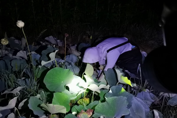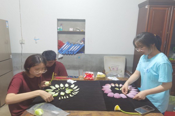 7月17日晚,气温下降、空气湿度升高,正是荷花采摘保鲜的最佳时间。调研团成员们着装整齐,在合肥市植物园科普中心宇胜老师的带领下踏入荷塘,采摘友谊牡丹莲、千瓣莲和中山红台(至尊千瓣)等荷花品种的花苞及荷叶,并进行鲜切实验和数据记录。根据整理的实验数据结合产业现状,团队对长庄荷花观赏产业做出分析与发展建议。
