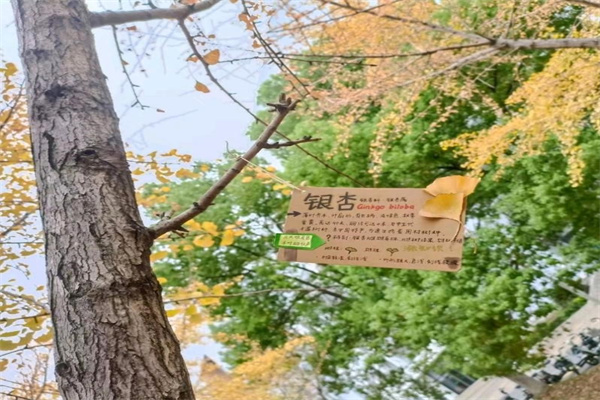 制作完成后,同学们手持自己精心制作的植物名牌饶有兴趣地交流着,彼此分享着植物知识。随后,同学们到校园中相应植物处悬挂植物名牌,吸引了不少师生前来围观。