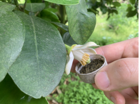 “一般我们会疏去树体上部的花,保留中下部花。因为上部果实易受大风、树叶剐蹭,果皮容易形成斑痕,影响文旦商品性。”果农向谢善鹏介绍到,由于文旦存在自交不亲和、裂果率高等问题,需要进行人工异花授粉,这对于当地果农来说是一年中最重要的工作。谢善鹏与果农一起,提前收集好福建白柚花粉,装进棕色小瓶、避光保存。授粉时,将花粉倒在瓶盖,轻轻调整盛开的文旦花,将花柱柱头沾碰花粉。当柱头表面沾满花粉时,就意味着完成了整个人工授粉过程。“诶,这花粉怎么黑乎乎的?是加了什么物质嘛?”谢善鹏看着瓶盖中的花粉问到。“我在花粉中加入了一些烟囱灰,这样原本黄色的花粉变得暗黑,便于区分是否完成授粉。”果农解释道。谢善鹏突然想到本科猕猴桃授粉实习时,会将猕猴桃花粉与红色石松粉进行拌匀,其目的也是为了区分是否完成授粉。