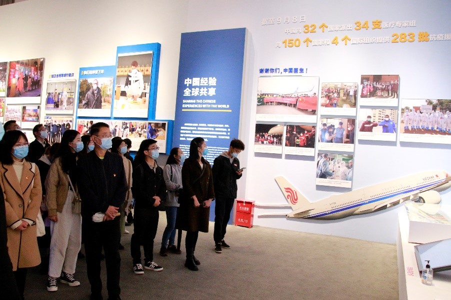 随着讲解员的解读,同学们沿着展厅参观。刚踏入展厅,各位同学就被序篇震撼的影像资料深深吸引,回顾那段艰难的抗疫岁月,不禁热泪盈眶、感慨万千。展览综合运用图片、文字、视频、实物等多种表现形式,营造立体展陈空间,包括序篇、结语和“运筹帷幄,掌舵领航”等六个部分。