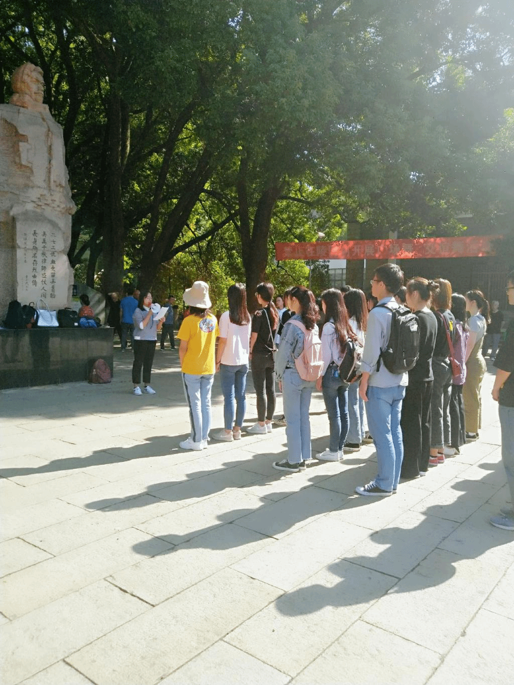 大会伊始,全体人员奏唱《国际歌》,这首讴歌巴黎公社战士崇高的共产主义理想和英勇不屈的革命气概的歌曲,在施洋烈士纪念馆内不断回荡。随后,园林第二党支部的正式党员刘岩宣读了参与本次宣誓的预备党员名单,并由园林第二党支部的正式党员吴镜杰作为领誓人带领他们在党旗前宣读入党誓词。烈日炎炎,施洋烈士的雕像前,党旗正随风飘扬。党员们排列整齐、目光坚毅,他们面向党旗,庄严宣誓,表明了自己为共产主义事业奋斗的坚定决心与昂扬斗志。
