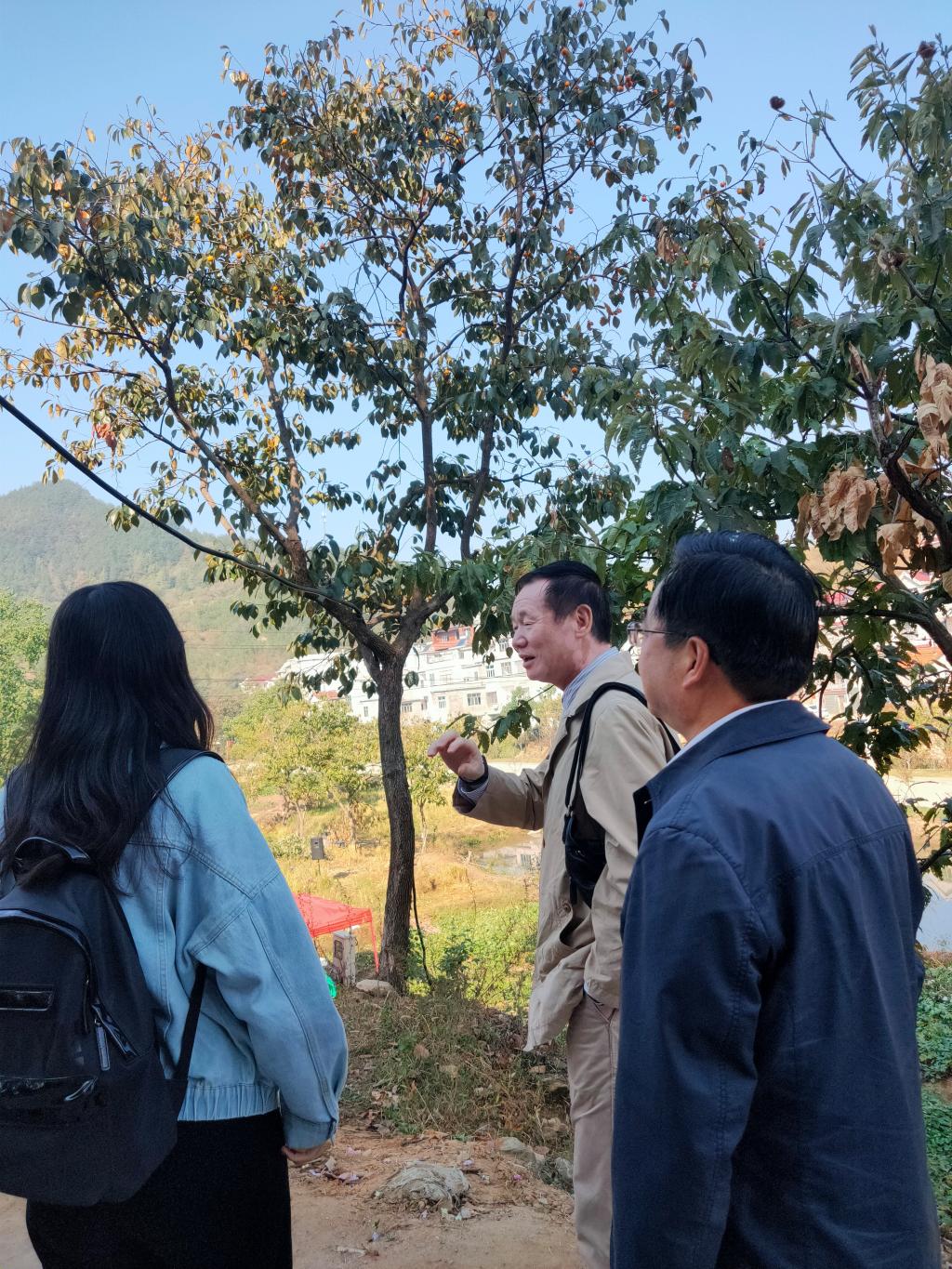 果树系师生党员一行人前往主会场进行参观交流,罗正荣与当地村主任、县财政局长就后续“百柿园”项目的品种搭配、配套设施以及国内外发展概况进行探讨。