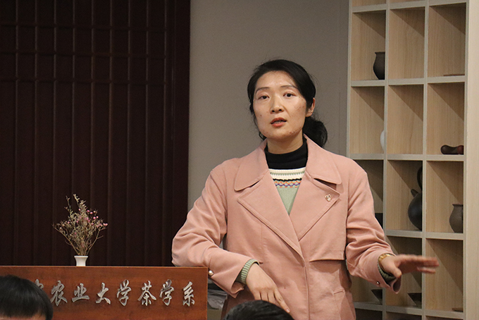 副教授郭飞与同学们交流了目前茶树的小RNA功能的鉴定分析,接着副教授赵华给同学们展示了有机茶园的管理,同时她还向大家讲述了目前富“硒”茶研究的现状。她表示,当前的富硒茶还有很大的改进空间,这就给茶学人带来了新的挑战。她说:“硒茶是我们湖北的特色品牌,把硒茶做好是我们的责任与使命。”讲师王郁向同学们介绍了茶树的多倍体育种让同学们了解到茶树多倍体育种的积极意义。“目前,茶学领域还存在着尚未攻克的难题。”讲师王明乐向大家讲述了目前茶树组培领域的难关,茶树组织中内生菌等问题尚未得到很好的解决,让诱导出的茶苗“夭折”在培养皿中。老师们的分享让同学们大开眼界,从崭新的角度认识到了茶学专业。