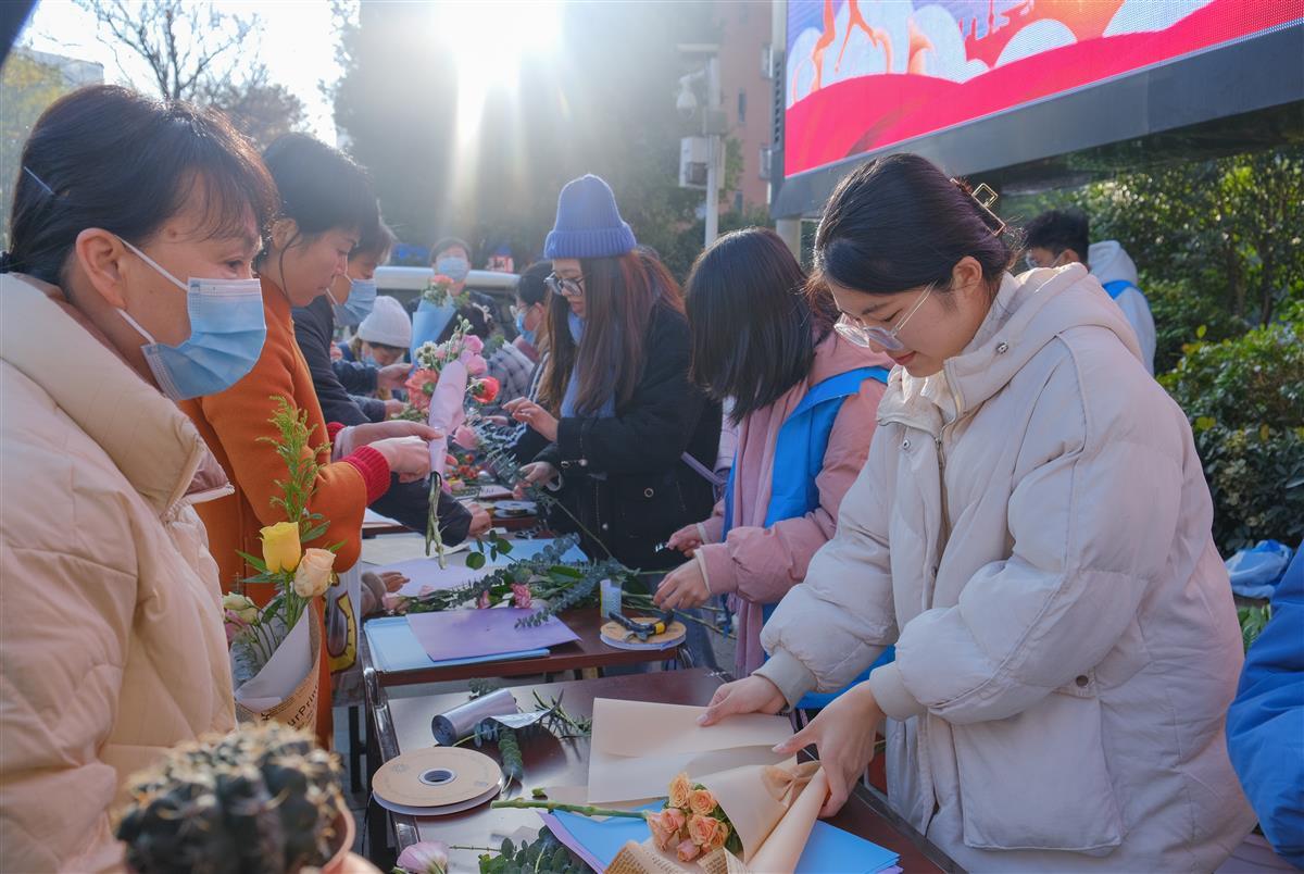 居民们挑选出自己喜欢的花卉品种,在学生志愿者的指导下,用剪刀进行修剪、去除花柄上的尖刺,并用丝带缠绕包装纸,一束精美的手捧花便制作成功。百余名居民先后进行了体验。