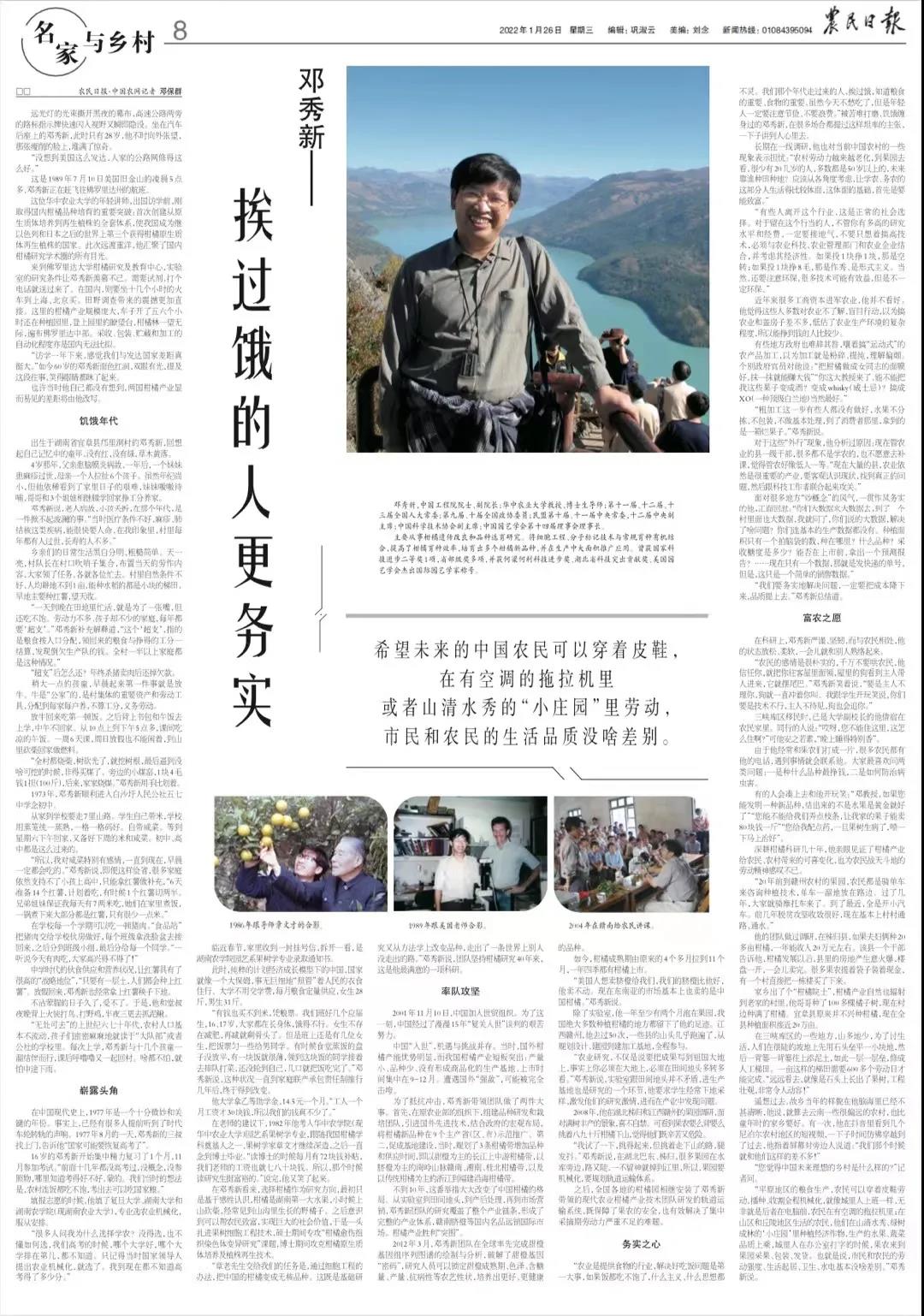 不到10年,这番举措大大改变了中国柑橘的格局。从实验室到田间地头,到产后处理,再到市场营销,邓秀新团队的研究覆盖了整个产业链条,形成了完整的产业体系,赣南脐橙等国内名品远销国际市场。柑橘产业胜利“突围”。